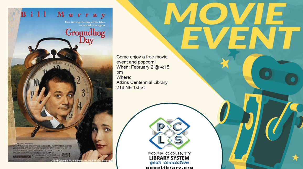 Primary tabs Upcoming List Month Week Day Remind Me Add To My Calendar Print Share Program Type: Movie Age Group: All Ages Please note you are looking at an event that has already happened. Program Description Event Details Come enjoy this movie about a guy who lives the same day over and over again.