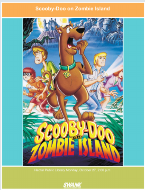 Come watch a cartoon dog and his friends get chased by zombies on Monday, October 27, here at the Hector Public Library from 2:00 - 3:30 p.m. We will serve popcorn!